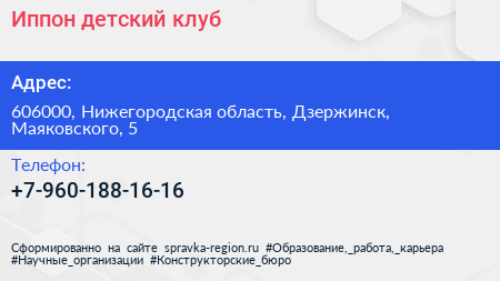 Иппон, детский клуб по адресу 606000, Нижегородская область, Дзержинск, Маяковского, 5 в дальнейшем Организация, размещена в следующих категориях:
