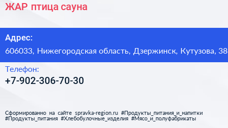 ЖАР-птица, сауна по адресу 606033, Нижегородская область, Дзержинск, Кутузова, 38 в дальнейшем Организация, размещена в следующих категориях: