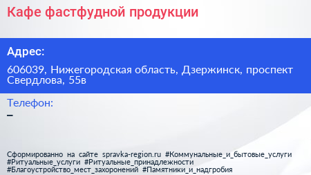Кафе фастфудной продукции по адресу 606039, Нижегородская область, Дзержинск, проспект Свердлова, 55в в дальнейшем Организация, размещена в следующих категориях: