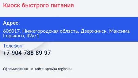 Киоск быстрого питания по адресу 606017, Нижегородская область, Дзержинск, Максима Горького, 42а/1 в дальнейшем Организация, размещена в следующих категориях: