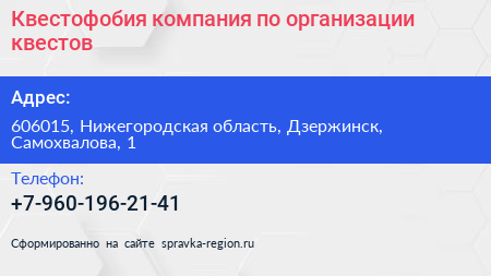 Квестофобия, компания по организации квестов по адресу 606015, Нижегородская область, Дзержинск, Самохвалова, 1 в дальнейшем Организация, размещена в следующих категориях: