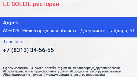 LE SOLEIL, ресторан по адресу 606029, Нижегородская область, Дзержинск, Гайдара, 61 в дальнейшем Организация, размещена в следующих категориях:
