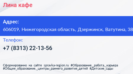 Лина, кафе по адресу 606019, Нижегородская область, Дзержинск, Ватутина, 38 в дальнейшем Организация, размещена в следующих категориях: