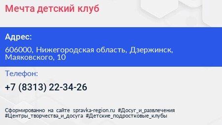 Мечта, детский клуб по адресу 606000, Нижегородская область, Дзержинск, Маяковского, 10 в дальнейшем Организация, размещена в следующих категориях: