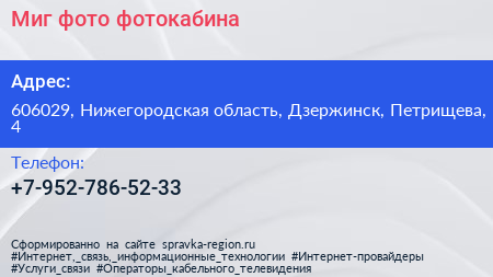 Миг фото, фотокабина по адресу 606029, Нижегородская область, Дзержинск, Петрищева, 4 в дальнейшем Организация, размещена в следующих категориях: