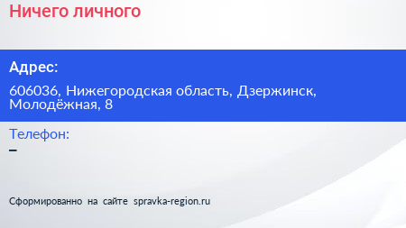 Ничего личного по адресу 606036, Нижегородская область, Дзержинск, Молодёжная, 8 в дальнейшем Организация, размещена в следующих категориях: