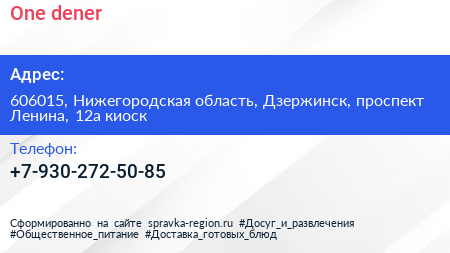 One dener по адресу 606015, Нижегородская область, Дзержинск, проспект Ленина, 12а киоск в дальнейшем Организация, размещена в следующих категориях: