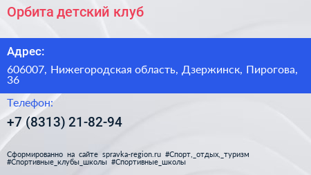 Орбита, детский клуб по адресу 606007, Нижегородская область, Дзержинск, Пирогова, 36 в дальнейшем Организация, размещена в следующих категориях: