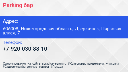 Parking, бар по адресу 606008, Нижегородская область, Дзержинск, Парковая аллея, 7 в дальнейшем Организация, размещена в следующих категориях:
