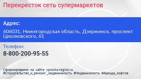 Перекресток, сеть супермаркетов по адресу 606031, Нижегородская область, Дзержинск, проспект Циолковского, 61 в дальнейшем Организация, размещена в следующих категориях: