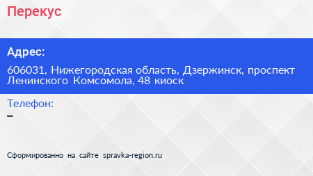 Перекус по адресу 606031, Нижегородская область, Дзержинск, проспект Ленинского Комсомола, 48 киоск в дальнейшем Организация, размещена в следующих категориях: