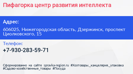 Пифагорка, центр развития интеллекта по адресу 606025, Нижегородская область, Дзержинск, проспект Циолковского, 15 в дальнейшем Организация, размещена в следующих категориях: