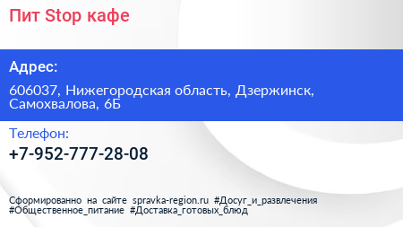Пит Stop, кафе по адресу 606037, Нижегородская область, Дзержинск, Самохвалова, 6Б в дальнейшем Организация, размещена в следующих категориях: