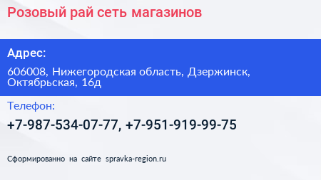 Розовый рай, сеть магазинов по адресу 606008, Нижегородская область, Дзержинск, Октябрьская, 16д в дальнейшем Организация, размещена в следующих категориях: