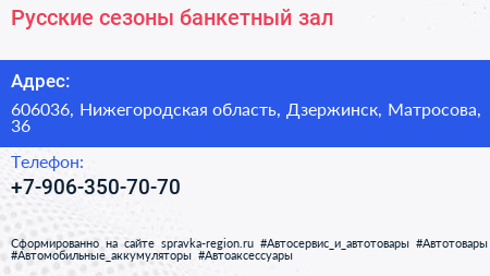 Русские сезоны, банкетный зал по адресу 606036, Нижегородская область, Дзержинск, Матросова, 36 в дальнейшем Организация, размещена в следующих категориях: