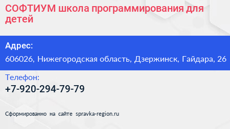 СОФТИУМ, школа программирования для детей по адресу 606026, Нижегородская область, Дзержинск, Гайдара, 26 в дальнейшем Организация, размещена в следующих категориях: