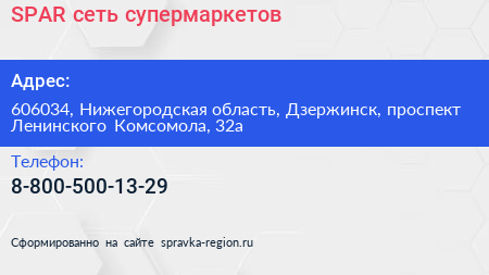 SPAR, сеть супермаркетов по адресу 606034, Нижегородская область, Дзержинск, проспект Ленинского Комсомола, 32а в дальнейшем Организация, размещена в следующих категориях:
