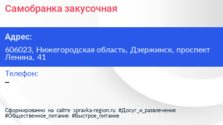Самобранка, закусочная по адресу 606023, Нижегородская область, Дзержинск, проспект Ленина, 41 в дальнейшем Организация, размещена в следующих категориях:
