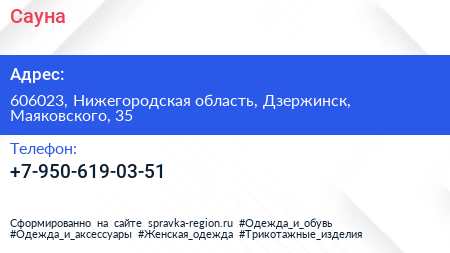 Сауна по адресу 606023, Нижегородская область, Дзержинск, Маяковского, 35 в дальнейшем Организация, размещена в следующих категориях: