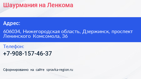 Шаурмания на Ленкома по адресу 606034, Нижегородская область, Дзержинск, проспект Ленинского Комсомола, 36 в дальнейшем Организация, размещена в следующих категориях: