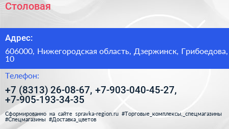 Столовая по адресу 606000, Нижегородская область, Дзержинск, Грибоедова, 10 в дальнейшем Организация, размещена в следующих категориях: