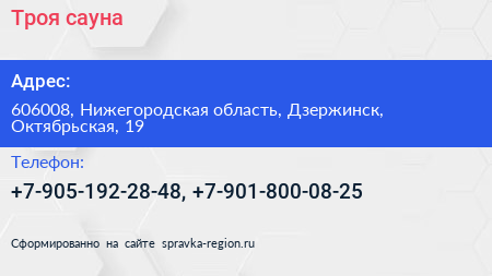 Троя, сауна по адресу 606008, Нижегородская область, Дзержинск, Октябрьская, 19 в дальнейшем Организация, размещена в следующих категориях: