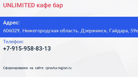 UNLIMITED, кафе-бар по адресу 606029, Нижегородская область, Дзержинск, Гайдара, 59е в дальнейшем Организация, размещена в следующих категориях: