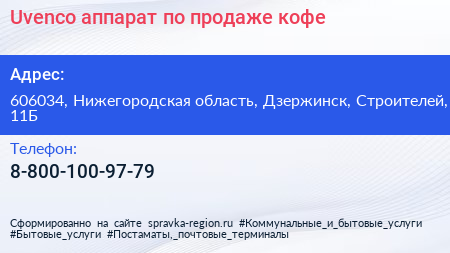 Uvenco, аппарат по продаже кофе по адресу 606034, Нижегородская область, Дзержинск, Строителей, 11Б в дальнейшем Организация, размещена в следующих категориях: