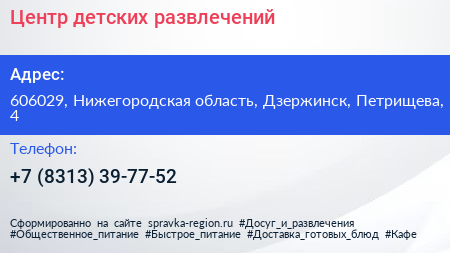 Центр детских развлечений по адресу 606029, Нижегородская область, Дзержинск, Петрищева, 4 в дальнейшем Организация, размещена в следующих категориях: