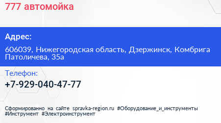 777, автомойка по адресу 606039, Нижегородская область, Дзержинск, Комбрига Патоличева, 35а в дальнейшем Организация, размещена в следующих категориях: