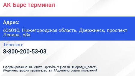 АК Барс, терминал по адресу 606010, Нижегородская область, Дзержинск, проспект Ленина, 68а в дальнейшем Организация, размещена в следующих категориях: