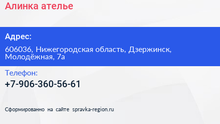 Алинка, ателье по адресу 606036, Нижегородская область, Дзержинск, Молодёжная, 7а в дальнейшем Организация, размещена в следующих категориях: