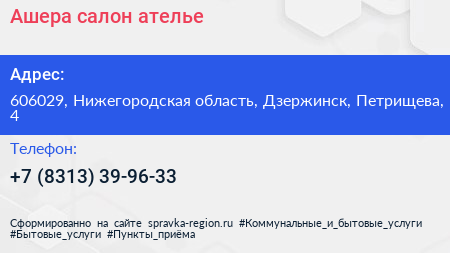 Ашера, салон-ателье по адресу 606029, Нижегородская область, Дзержинск, Петрищева, 4 в дальнейшем Организация, размещена в следующих категориях:
