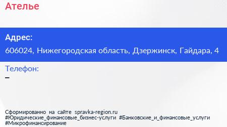Ателье по адресу 606024, Нижегородская область, Дзержинск, Гайдара, 4 в дальнейшем Организация, размещена в следующих категориях:
