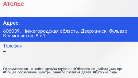 Ателье по адресу 606039, Нижегородская область, Дзержинск, бульвар Космонавтов, 8 к1 в дальнейшем Организация, размещена в следующих категориях: