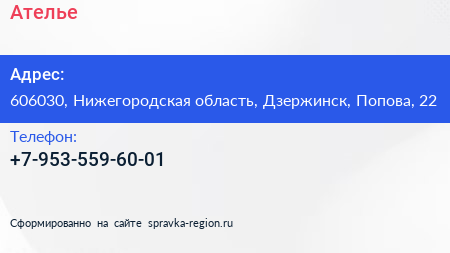 Ателье по адресу 606030, Нижегородская область, Дзержинск, Попова, 22 в дальнейшем Организация, размещена в следующих категориях: