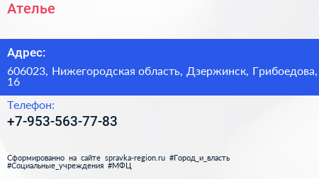 Ателье по адресу 606023, Нижегородская область, Дзержинск, Грибоедова, 16 в дальнейшем Организация, размещена в следующих категориях:
