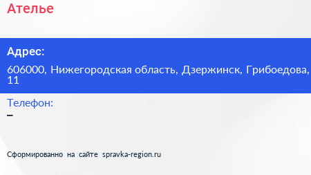 Ателье по адресу 606000, Нижегородская область, Дзержинск, Грибоедова, 11 в дальнейшем Организация, размещена в следующих категориях:
