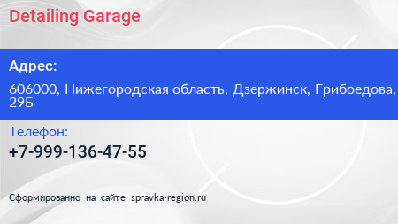 Detailing Garage по адресу 606000, Нижегородская область, Дзержинск, Грибоедова, 29Б в дальнейшем Организация, размещена в следующих категориях: