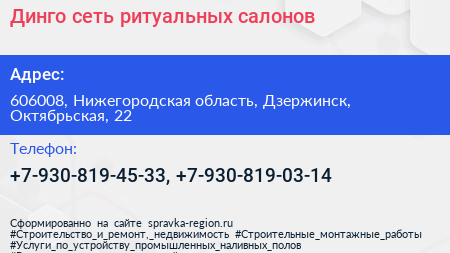 Динго, сеть ритуальных салонов по адресу 606008, Нижегородская область, Дзержинск, Октябрьская, 22 в дальнейшем Организация, размещена в следующих категориях: