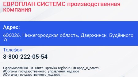 ЕВРОПЛАН CИСТЕМС, производственная компания по адресу 606026, Нижегородская область, Дзержинск, Будённого, 7г в дальнейшем Организация, размещена в следующих категориях: