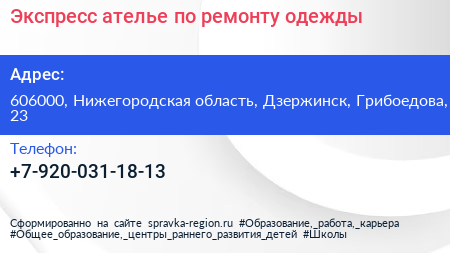 Экспресс, ателье по ремонту одежды по адресу 606000, Нижегородская область, Дзержинск, Грибоедова, 23 в дальнейшем Организация, размещена в следующих категориях: