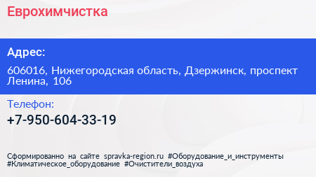 Еврохимчистка по адресу 606016, Нижегородская область, Дзержинск, проспект Ленина, 106 в дальнейшем Организация, размещена в следующих категориях: