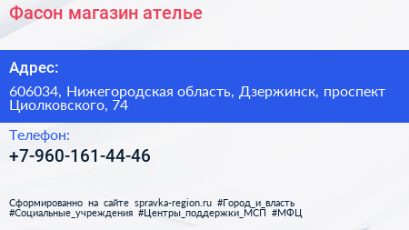 Фасон, магазин-ателье по адресу 606034, Нижегородская область, Дзержинск, проспект Циолковского, 74 в дальнейшем Организация, размещена в следующих категориях: