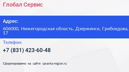 Глобал Сервис по адресу 606000, Нижегородская область, Дзержинск, Грибоедова, 17 в дальнейшем Организация, размещена в следующих категориях: