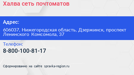 Халва, сеть почтоматов по адресу 606037, Нижегородская область, Дзержинск, проспект Ленинского Комсомола, 37 в дальнейшем Организация, размещена в следующих категориях: