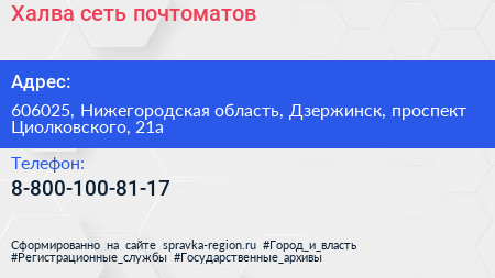 Халва, сеть почтоматов по адресу 606025, Нижегородская область, Дзержинск, проспект Циолковского, 21а в дальнейшем Организация, размещена в следующих категориях: