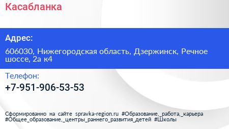 Касабланка по адресу 606030, Нижегородская область, Дзержинск, Речное шоссе, 2а к4 в дальнейшем Организация, размещена в следующих категориях: