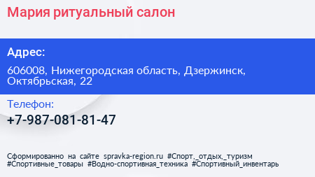 Мария, ритуальный салон по адресу 606008, Нижегородская область, Дзержинск, Октябрьская, 22 в дальнейшем Организация, размещена в следующих категориях: