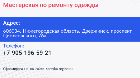 Мастерская по ремонту одежды по адресу 606034, Нижегородская область, Дзержинск, проспект Циолковского, 76а в дальнейшем Организация, размещена в следующих категориях: